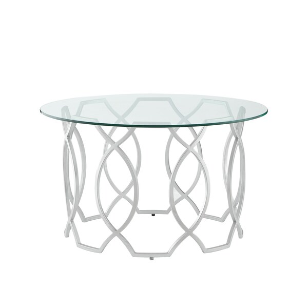 This good looking 32-inch clear and silver glass and iron round coffee table is not only practical, but good looking and built to last. The silver coloration of the high quality iron base marries nicely with the clear glass top surface. This round table utilizes its unique shape to give your room a modern geometric accent. If you're looking for something that can fit into a living area, bedroom, or office, this coffee table is for you. This coffee table is the sturdy, reliable and stylish answer to your living room needs. 18-inch H x 32-inch W x 32-inch D