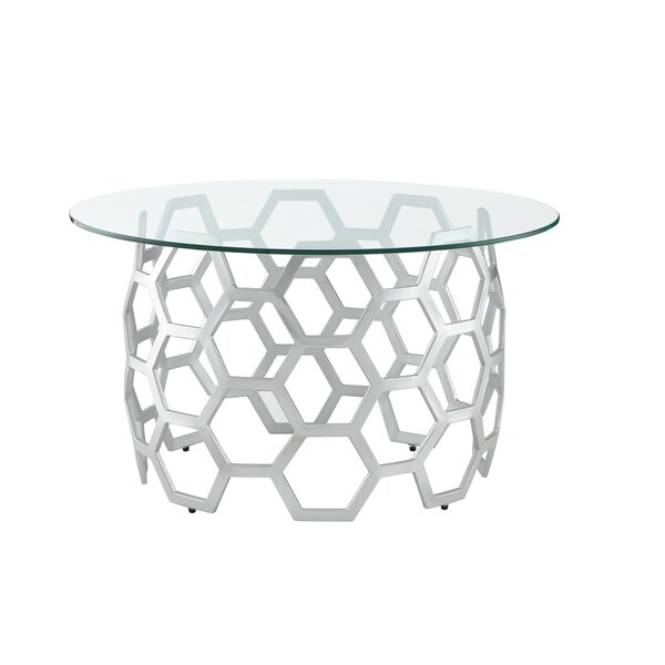 Add handsome, fashionable design to your living space with this 32-inch clear and silver glass and iron round coffee table. Quality construction from the silver iron base combines with clear glass of the top to give this table a fresh and updated look. This round table features a fresh and stylish shape to give your room a visually pleasing accent. It has a fresh design that will definitely breathe some fresh air into your interior. This coffee table is the sturdy, reliable and stylish answer to your living room needs. 18-inch H x 32-inch W x 32-inch D