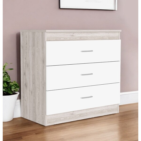 Make your room functional and visually enticing with this masterful 32-inch white and gray three drawer dresser. This horizontal standard dresser has a convenient and wide top area for your getting ready needs and supplies. Equipped with three easy open drawers for practical and good looking clothing storage. Its a high quality piece, made from high grade manufactured wood. 29.7-inch H x 31.5-inch W x 16-inch D