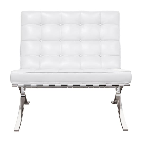 Unique and decorative, this 32-inch white and silver italian leather tufted lounge chair will leave a lasting impression. This sturdy italian leather upholstered lounge chair comes in a chic solid white color to give your space just the right look. The sturdy inner frame is built with high quality stainless steel, featuring a tufted back that is accented with soft and comfortable cushioning. The tufted cushions add fine designer detailing. Nailhead trim gives this chair a refined look that adds additional texture and visual interest. 32-inch h x 31.5-inch w x 30-inch d.