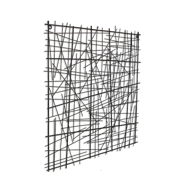 The 32-inch x 32-inch black handcrafted abstract lines metal hanging dimensional sculpture is the perfect decorative accessory for your home. Adding this hanging wall art to your space to make your room feel more finished and attractive. Utilize this opportunity to create a focal point in the room with this fabulous wall decor option. 31.5-inch H x 31.5-inch W x 0.75-inch D