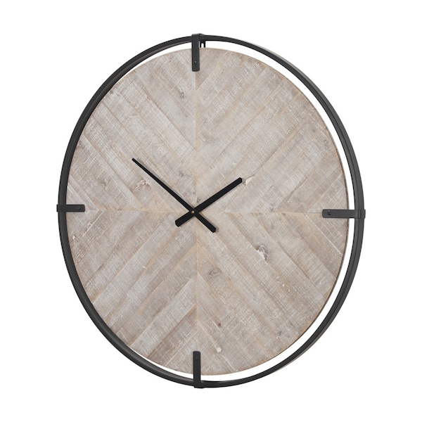 This 33-inch black and natural metal and solid wood analog distressed round wall clock includes three moving hands on the face that move smoothly to indicate the hour, minute and seconds. The round shape of this clock will bring a sense of wholeness to your home. Made from the highest quality wood, the clock face not only looks good but will stand the test of time. This clock was skillfully made with a purposefully distressed and vintage style finish. Elevate the decor of any room in your house. The eye-catching makeup of this clock will ensure that you never run late again. 33.46-inch h x 33.46-inch w x 1.57-inch d.