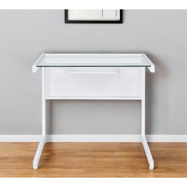 Bring this classic style 33-inch clear and white glass and stainless steel writing desk to your living room, home office or bedroom as a practical and fashionable accent. With a classic shape and style, this well made rectangular desk is a stylish way to keep your office space looking good. Built to last, this sturdy desk is designed for comfort and efficiency for years to come. 30.32-inch h x 33.47-inch w x 27.56-inch d.