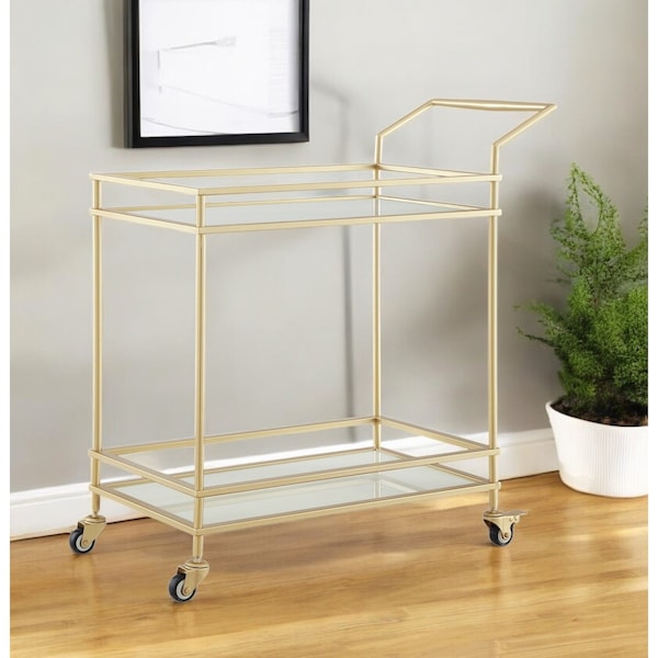 33" Gold And White Iron and Glass Rolling Bar Cart