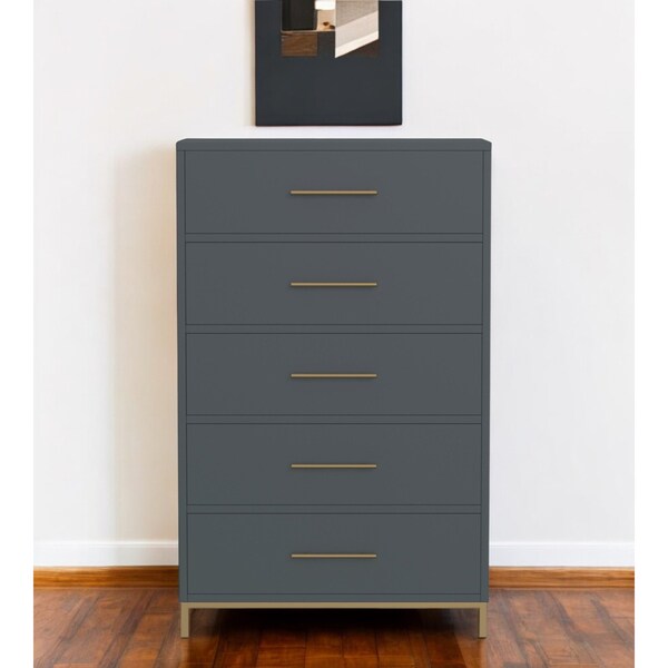 This 33-inch gray solid wood five drawer dresser is a practical and good looking accent for your bedroom storage and organizational needs. This vertical chest dresser has a narrow footprint but packs lots of storage. Equipped with five easy open drawers for practical and good looking clothing storage. This dresser is built to last from high quality solid wood, the gray coloration of this piece is neutral and will blend easily with most any decor. 52-inch h x 33-inch w x 21-inch d.