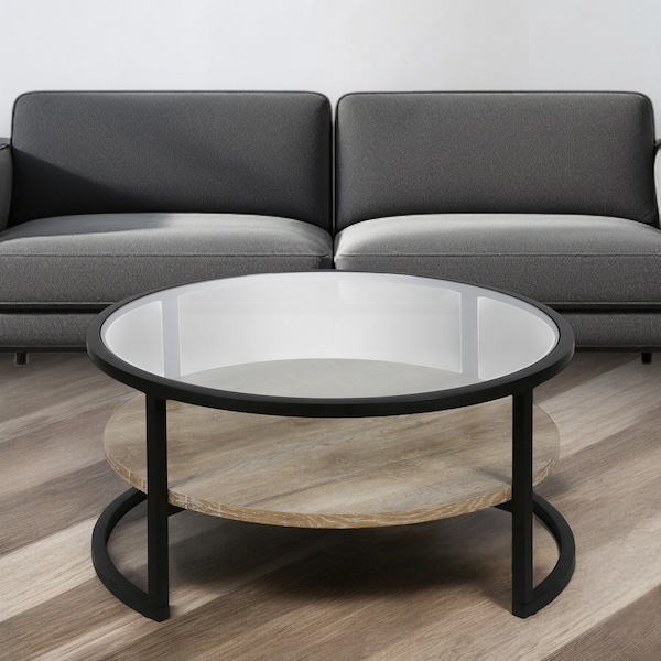 Give your living room, family room, or office the perfect anchor piece with this 34-inch black glass and steel round coffee table with shelf. This table features an updated monotone color scheme with black as the main color on both the glass top and the steel base. Includes a single shelf for handy storage or display space. This round table utilizes its unique shape to give your room a modern geometric accent. It has a fresh design that will definitely breathe some fresh air into your interior. This coffee table is the sturdy, reliable and stylish answer to your living room needs. 17-inch H x 34-inch W x 34-inch D