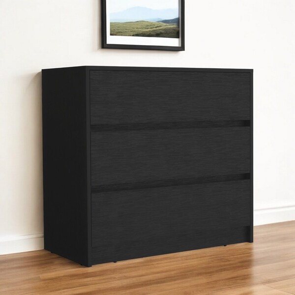 Add personality to your bedroom style and a feeling of coziness with this 34-inch black three drawer dresser. This horizontal standard dresser has a convenient and wide top area for your getting ready needs and supplies. Equipped with three easy open drawers for practical and good looking clothing storage. Its a high quality piece, made from high grade manufactured wood. The black coloration of this piece gives it an updated, and modern edge. 31.5-inch H x 33.5-inch W x 17-inch D