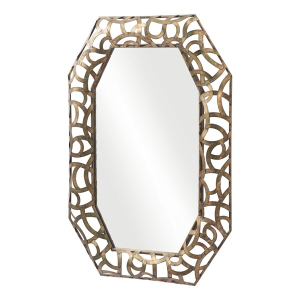 Add a touch of sunshine to any space in your home with this 35-inch bronze octagonal steel framed accent mirror. The unique painted steel frame features a distressed painted gold finish with looping metal scrolls to frame the mirrored glass. This mirror makes any room glow with its fantastic and glamorous frame. This unique mirror will look great as part of your existing decor or you can use it as a statement piece anywhere in your home. 35-inch H x 24-inch W x 2-inch D