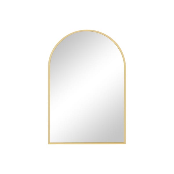 This 35-inch gold metal arch framed accent mirror will be the perfect way to add some brightness and utility into your bathroom or any room. Framed with rust resistant metal, this mirror will bring practical application and fashionable design to any space, including the bathroom or high humidity coastal areas. Featuring the highest quality glass and a chic design that will add some modern flair to your decor. Features anti-fog and quality craftsmanship in every facet that ensures durability and long-lasting wear. This mirror will provide an exceptional visual experience. 35.43-inch h x 23.62-inch w x 0.55-inch d.