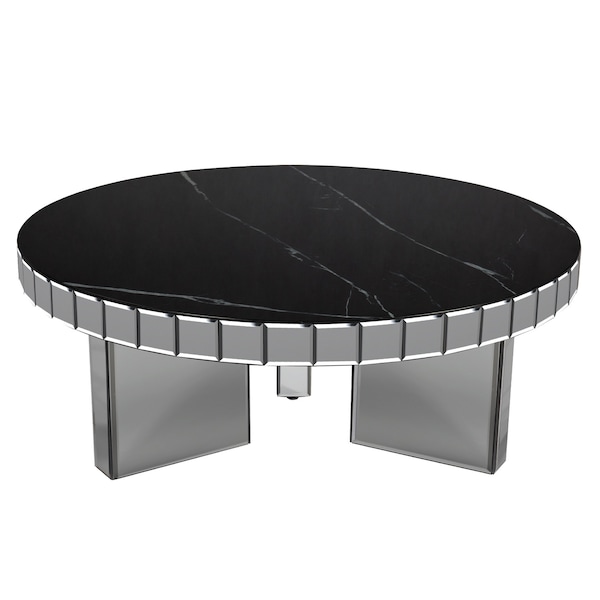 Add handsome, fashionable design to your living space with this 35-inch silver and black mirrored glass and faux marble round coffee table. A reflective mirrored glass frame is finished off with a black faux marble top that is the epitome of quality construction and design. The sparkling beveled pieces of mirrored glass give this table a glamorous and unique look. It has an attractive design that will definitely breathe some fresh air into your interior. This coffee table is the sturdy, reliable and stylish answer to your living room needs. 13.8-inch h x 35.4-inch w x 35.4-inch d.