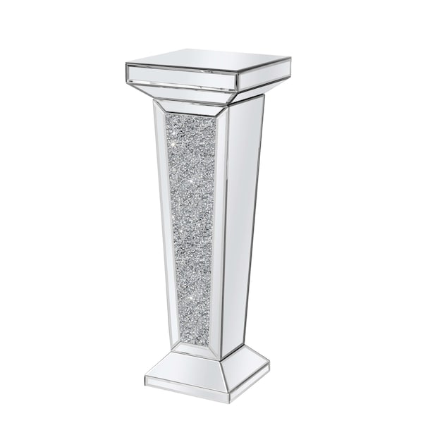 Optimize your space and add some charm to your room with the 35-inch silver mirrored glass and faux crystals pedestal accent table. This table features quality construction with an inner frame made of manufactured wood that is clad with pieces of reflective and sparkly beveled mirrored glass and faux crystals. This glamorous high top accent table is great as a drink or snack spot when entertaining, or as a display stand. Would look fabulous next doorway, fireplace, or stairs with a vase or sculptural piece on top. You can also use it as an entryway table to hold your keys. 35.43-inch h x 12.60-inch w x 10.24-inch d.