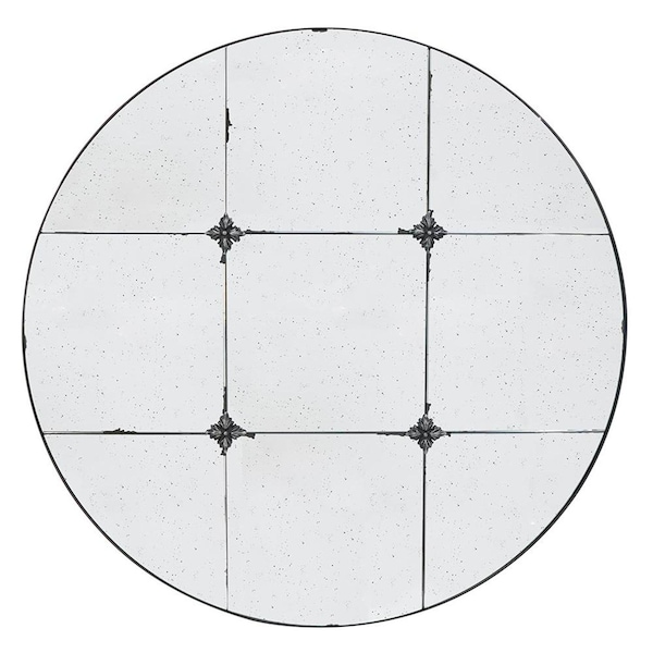 Beautify your space with this 36-inch black round iron framed antiqued glass accent mirror. An antiqued and distressed mirror finish gives this piece lots of vintage charm. Framed with iron, this mirror will bring practical application and fashionable design to your space, adding some traditional flair to your decor. This mirror will be a great useful addition to your home but will also help elevate the space in the room. Add this exceptional quality mirror to your space for a beautiful reflection and a bit of elevated style. 35.8-inch h x 35.8-inch w x 1.5-inch d.