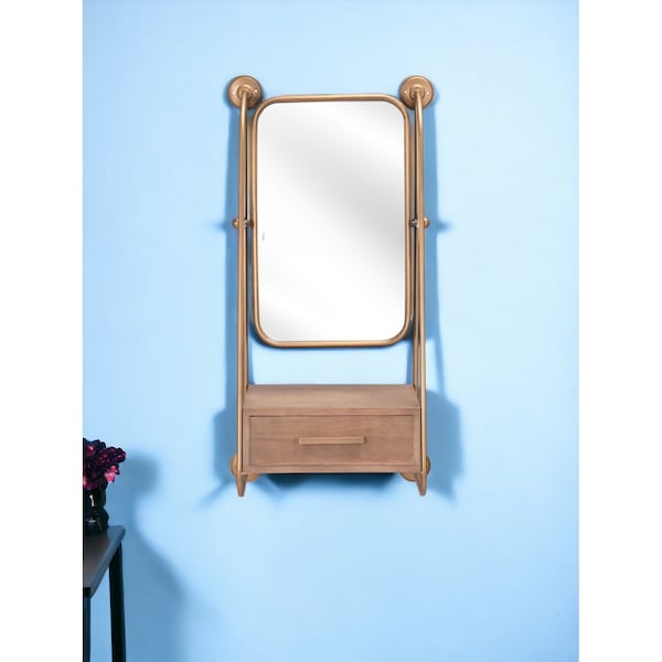 A delectable piece of furniture, this 36-inch gold steel framed accent mirror is an embellishment perfect for your rooms. The frame is made from steel and features a unique design in a stainless steel finish. This rectangle shaped mirror will open up any space you put in piece in. This frame works nicely with the full-bodied mirror in the middle. Its contemporary style makes this mirror a favorite for bringing some flair to your decor. Its both exceptional and tasteful, and its tough as well. This unique mirror will look great as part of your existing wall decor or you can use it as a statement piece anywhere in your home. 35.6-inch H x 18.9-inch W x 11-inch D