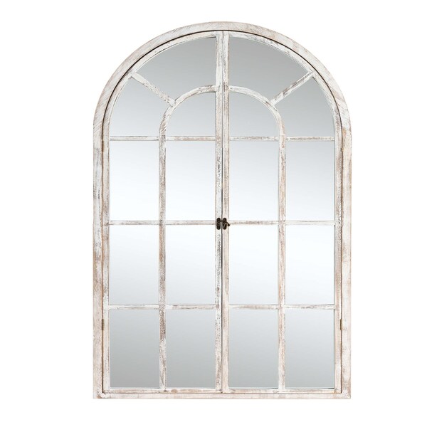 An antiqued and distressed mirror finish gives this piece lots of vintage charm. Add a touch of classic elegance to your space with this white framed antique mirror. Its arch shape and vertical orientation make it a stylish addition to any room. The wooden frame design adds a casual yet sophisticated vibe, complementing the antique mirror finish beautifully. Measuring at 23.973 inches wide, this wall-mounted mirror is perfect for enhancing the decor in your home. The white frame finish brings a fresh and airy feel, making it a versatile piece that can easily blend with various interior styles. 35.76-inch H x 23.97-inch W x 1.18-inch D