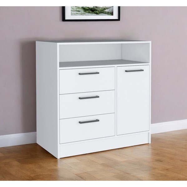 Make your room functional and visually enticing with this masterful 36-inch white three drawer combo dresser. Versatile in use, this combo dresser is equipped with both drawers and doors for all your storage needs. Equipped with three easy open drawers for practical and good looking clothing storage. Its a high quality piece, made from high grade manufactured wood. The white coloration of this piece is neutral and will blend easily with most any decor. 36.7-inch H x 35.5-inch W x 20-inch D