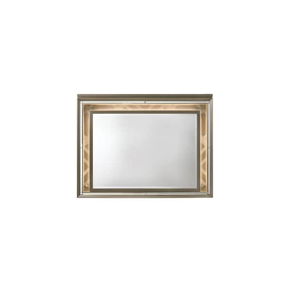 This 37-inch champagne lighted wood framed mounted dresser mirror adds the finishing touch to your bedroom. Framed with wood, this mirror will bring practical application and fashionable design to your space, adding some contemporary flair to your decor. This mirror will be a great useful addition to your home but will also help elevate the space in the room. This mirror is the perfect choice to update your bedroom and create a sanctuary of comfortable and inviting relaxation for your home for years to come. Produced with premium quality glass for a beautiful reflection, this mirror will provide an exceptional visual experience. 37-inch h x 49-inch w x 2-inch d.