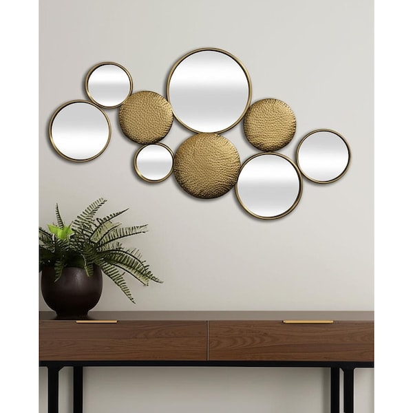 Add a touch of fashion to any space in your home with this 37-inch gold metal and mirrored glass wall decor accent mirror. This unique design mixes wall art and mirrors to bring practical application and fashionable design to your space, adding some contemporary flair to your decor. Perfect for most any room, this grouping is a combination of six varying sized cojoined round mirrors that are also connected with hammered metal discs. All are finished in a gold tone that gives this piece a rich and sophisticated yet earthy vibe. Add this exceptional quality decorative mirror to your space for a beautiful reflection and a bit of elevated style. 23-inch h x 37-inch w x 1.5-inch d.