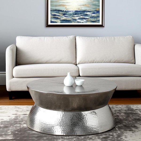 Make your living room or family room really stand out with this 37-inch silver aluminum round distressed solid coffee table. This table features quality construction from aluminum and an updated monotone color scheme with silver as the main color on both the top and the base. Complete with a purposefully distressed finish, this table has an aged, vintage, and rustic feel. If you're looking for something that can fit into a living area, bedroom, or office, this coffee table is for you. 16.5-inch h x 37-inch w x 37-inch d.