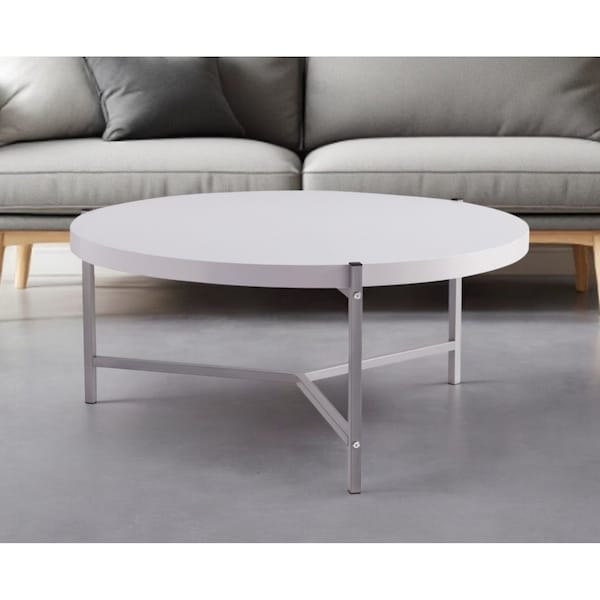 Give your living room, family room, or office the perfect anchor piece with this 37-inch white and silver wood and stainless steel round coffee table. The white manufactured wood top of this table is a nice visual contrast to the high quality, geometric shaped silver stainless steel of the base. This round top table utilizes its unique shape to give your room a modern geometric accent. If you're looking for something that can fit into a living area, bedroom, or office, this coffee table is for you. 16.5-inch H x 36.5-inch W x 36.5-inch D