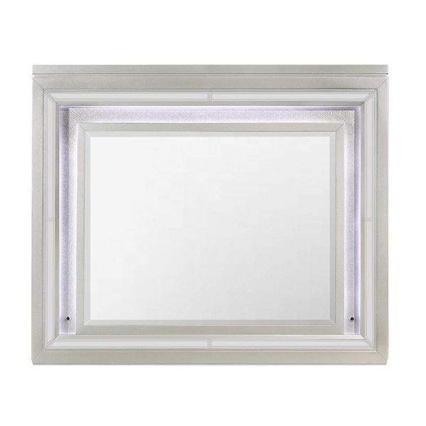 Beautify your space with this 38-inch champagne wood lighted mounted accent mirror. Framed with solid and manufactured wood, this mirror will bring practical application and fashionable design to your space, adding some contemporary flair to your decor. This mirror will be a great useful addition to your home but will also help elevate the space in the room. Produced with premium quality glass for a beautiful reflection, this mirror will provide an exceptional visual experience. 38-inch h x 46.5-inch w x 1-inch d.
