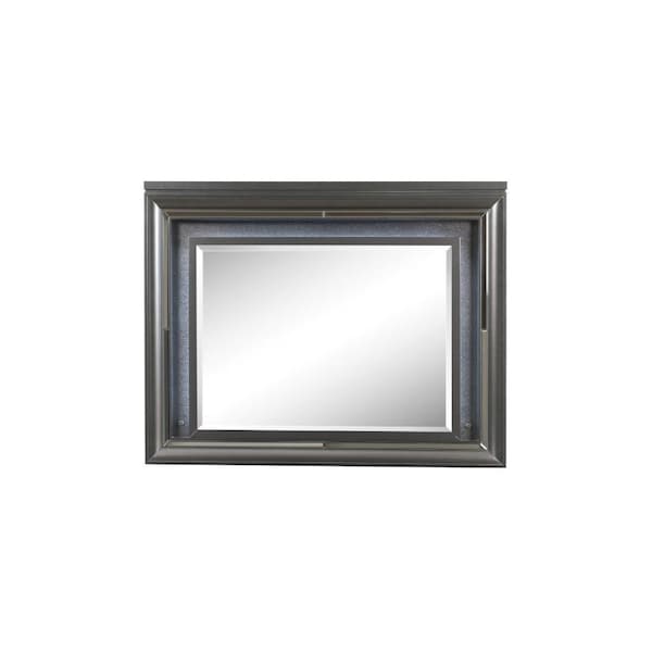 This 39-inch gunmetal lighted wood framed mounted dresser mirror adds the finishing touch to your bedroom. Framed with wood, this mirror will bring practical application and fashionable design to your space, adding some modern flair to your decor. Features quality craftsmanship in every facet that ensures durability and long-lasting wear. This mirror is the perfect choice to update your bedroom and create a sanctuary of comfortable and inviting relaxation for your home for years to come. Produced with premium quality glass for a beautiful reflection, this mirror will provide an exceptional visual experience. 39-inch h x 49-inch w x 2-inch d.