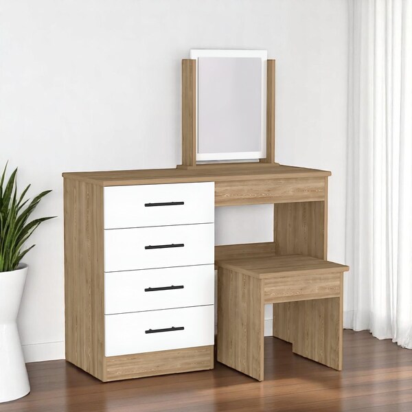 Our 39-inch natural and white wood four drawer vanity table with mirror and seat is designed to make getting ready a breeze. This table has a manufactured base in a chic two-tone color combination, which is an unmatchable combination of beauty and durability. Complete with a mirror and coordinating seat for you to sit while you get ready, this vanity set is the ideal way to get ready to start your day. Our vanity with included drawer space adds functionality along with a touch of elegance and sophistication to your space. Experience a new level of luxury and convenience. Get ready in style with our beautifully designed vanity table!. 49.9-inch h x 39.4-inch w x 17-inch d.