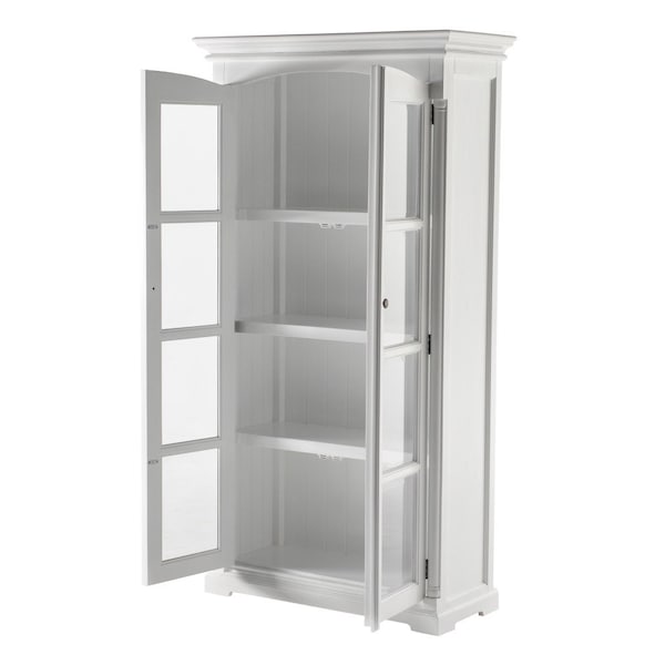 This 39-inch off white solid wood frame curio cabinet with glass doors and four shelves will be the perfect addition to your dining or living space. This beautiful accent is built to last from high quality solid wood, storage vessels don't have to be unsightly. Increase your storage space and the fashion quotient of your room with this hard wearing, versatile, and good looking cabinet. 74.8-inch h x 39.37-inch w x 16.73-inch d.