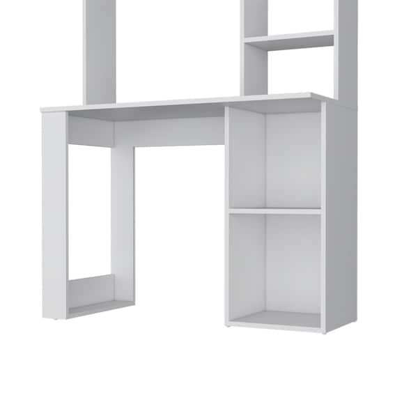 This 39-inch white wood computer desk with hutch will help to turn your office space into an executive suite. With a classic shape and style, this well made rectangular desk is a stylish way to keep your office space looking good. Built to last, this sturdy desk is designed for comfort and efficiency for years to come. 58.3-inch h x 38.8-inch w x 17.7-inch d.
