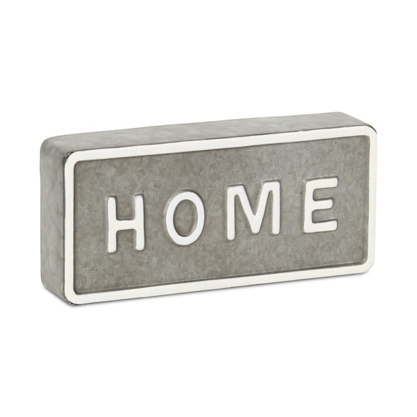 The 4-inch gray and white galvanized metal home hand painted tabletop sign is the perfect decorative accessory for your space. It's a perfect addition for those who love an up-to-the-minute look and feel. This handmade sculpture showcases the charming word "home," making it an inviting statement for any space. Crafted from durable galvanized metal, its purposeful distressing adds a vintage touch while enhancing its aesthetic appeal. Ideal for tabletops, this piece harmoniously blends contemporary design with a whimsical flair, elevating your home decor effortlessly. 4.00-inch h x 8.62-inch w x 1.38-inch d.