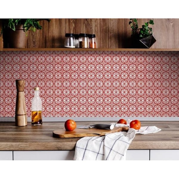4 x 4 in. Brick Red & White Scroll Peel & Stick Removable Tiles