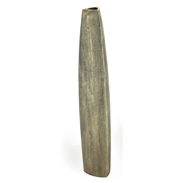 The 40-inch gold tapered ceramic floor vase is a stunning addition to any contemporary space. Designed with a sleek tapered shape, this vase effortlessly draws the eye and enhances your decor. Its purposeful coat/paint distressing adds a unique character, making each piece subtly distinct from the next. Crafted from high-quality ceramic, it offers durability alongside elegance. The luxurious gold color brings warmth and sophistication, perfectly complementing modern interior styles. Use this floor vase to elevate your living room, entryway, or office, serving as a captivating centerpiece. Its versatile design allows for both floral displays and as a standalone art piece, enhancing your home’s aesthetic appeal with a touch of glamour. 40-inch h x 8-inch w x 8-inch d.