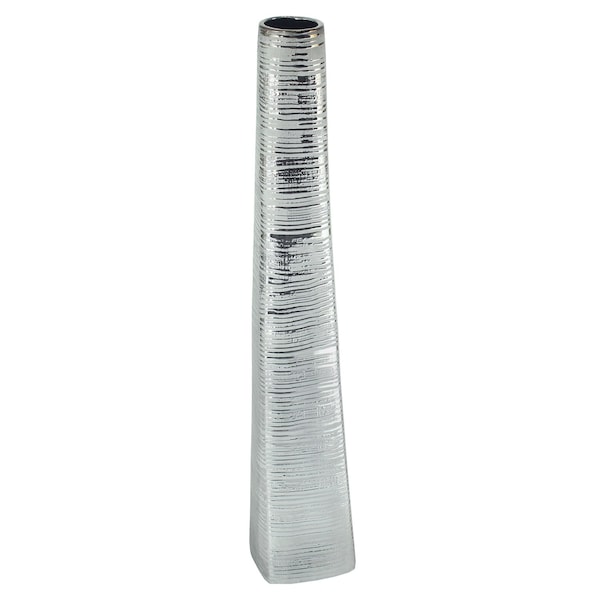 The 40-inch silver striped tapered ceramic floor vase is a stunning centerpiece that elevates any room. Its tapered shape adds a contemporary flair, making it perfect for both minimalist and modern decor. Crafted from high-quality ceramic, this vase showcases a beautiful silver finish that captures light beautifully. The purposeful coat/paint distressing technique lends an artistic touch, enhancing its unique character. Ideal for displaying fresh or artificial flowers, it serves as both a functional item and a stylish statement piece. This versatile floor vase can effortlessly transform your living space, adding elegance and sophistication to any corner of your home. Place it in a foyer, living room, or bedroom for an instant style upgrade. 40-inch h x 8-inch w x 8-inch d.