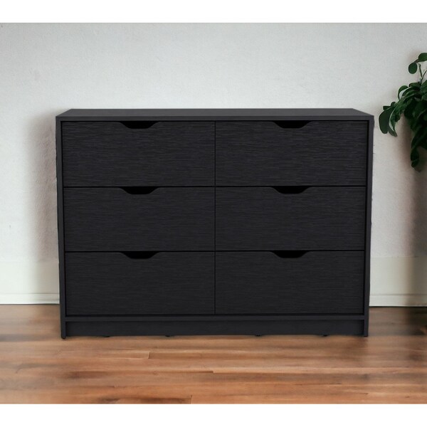 Enhance your room into a visually delightful and highly functional space with this 42-inch black four drawer dresser. This horizontal standard dresser has a convenient and wide top area for your getting ready needs and supplies. Equipped with four easy open drawers for practical and good looking clothing storage. Its a high quality piece, made from high grade manufactured wood. The black coloration of this piece gives it an updated, and modern edge. 30.67-inch H x 42.17-inch W x 16.26-inch D