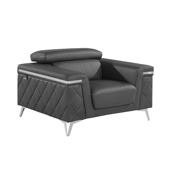 This 42-inch gray and silver top grain leather club chair is the perfect decorative yet functional accessory for your home. Built to last this club chair is finished in solid gray top grain leather to give your room a great update. The sturdy inner frame is built with high quality solid wood, includes armrests, and features a tight back that is accented with soft and comfortable cushioning. 38-inch h x 42-inch w x 42-inch d.