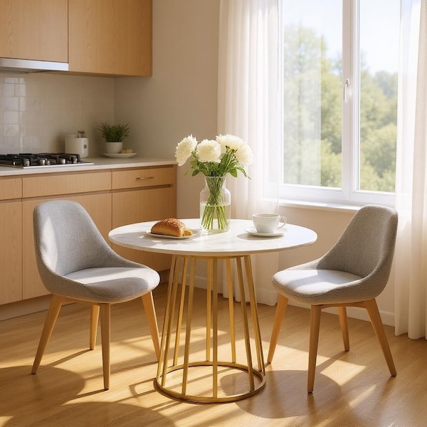 Add handsome, fashionable design to your dining space with this 42-inch white and gold marble and metal pedestal base round top dining table. A gold metal frame is finished off with a white marble top that is the epitome of quality construction and design. The two-tone finish adds to it's appeal. A beautiful pedestal base adds some dimension and elegance to your dining. Seat up to 5 family and friends around your new dining table. Complete your kitchen or dining room with this well made and stylish table. The dining table is a symbol for togetherness, special meals, and conversation. This 42-inch white and gold marble and metal pedestal base round top dining table is a must-have for your home. 29.9-inch h x 42-inch w x 42-inch d.