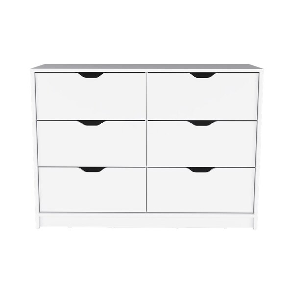 This 42-inch white four drawer dresser is a practical and good looking accent for your bedroom storage and organizational needs. This horizontal standard dresser has a convenient and wide top area for your getting ready needs and supplies. Equipped with four easy open drawers for practical and good looking clothing storage. Its a high quality piece, made from high grade manufactured wood. The white coloration of this piece is neutral and will blend easily with most any decor. 30.67-inch H x 42.17-inch W x 16.26-inch D