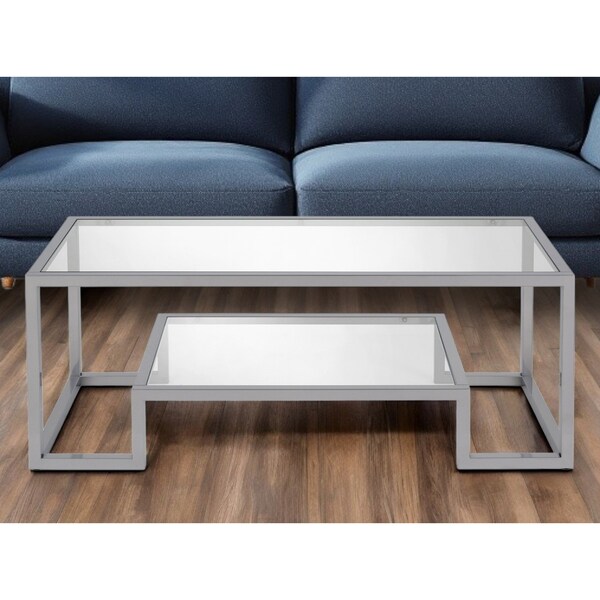 This good looking 45-inch silver glass and steel coffee table with shelf is sure to inspire compliments no matter where it sits. A sleek silver monotone color gives this steel and glass table a fresh and updated look. Includes a single shelf for handy storage or display space. This classic rectangular table will be a great accent in any room if you're looking for something that can fit into a living area, bedroom, or office, this coffee table is for you. This coffee table is the sturdy, reliable and stylish answer to your living room needs. 17-inch H x 45-inch W x 20-inch D