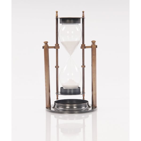 The sand timer, more commonly referred to as the hourglass, is a device used to keep track of time. Minutes are measured as sand moves from bulb to bulb. During a voyage, the hour glass would be one of few reliable ways to measure time at sea alongside a compass to assist overall navigation. This brass, invertible hourglass stands on a metal base, navigating us through our days. ? Made out of brass with a two-tone antique finish ? Revolving sand timer ? The sand flow duration is approximately 2 minute and 45 seconds.