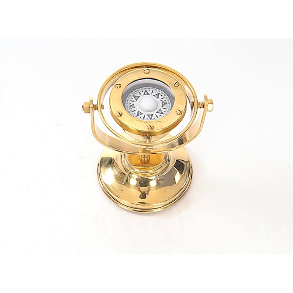 This is a fully functional gimbaled compass. It is made of high quality brass tinted with a golden glow. Each component is crafted with the finest craftsmanship. Available in shiny brass finish. This compass is a great addition to any nautical collection. The item dimensions are: L: 5 inches, W: 4.5 inches, H: 5.5 inches.