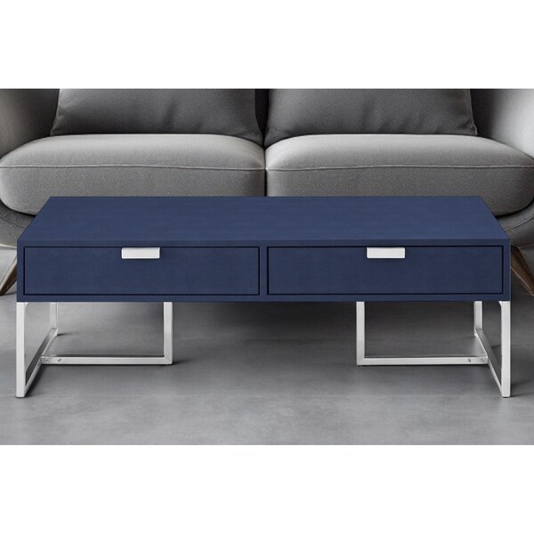 Make a statement with the 46-inch navy blue and silver metallic stainless steel coffee table with two drawers and infuse a dash of character and personality into your space. The base of this table is made from stainless steel in a silver metallic color that creates a good looking visual contrast to the navy blue manufactured wood tabletop. This rectangular table is an classic yet updated way to accent your room. It has a fresh design that will definitely breathe some fresh air into your interior. This coffee table is the sturdy, reliable and stylish answer to your living room needs. 15.7-inch H x 46.3-inch W x 22-inch D