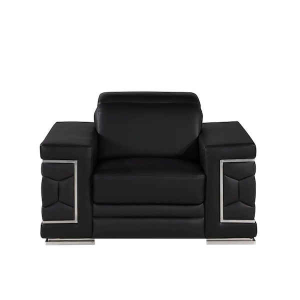 Unique and decorative, this 47-inch black and silver genuine leather club chair will leave a lasting impression. This sturdy genuine leather upholstered club chair comes in a chic solid black color to give your space just the right look. The high quality solid wood inner frame flaunts convenient armrests and a cushion back that are complimented by soft and comfortable cushioning. 39-inch h x 47-inch w x 41-inch d.