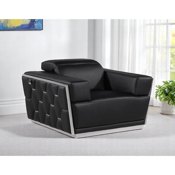 A mix of form and function, this 47-inch black and silver Italian leather club chair will bring a good looking and usable accent to your space. This sturdy Italian leather upholstered club chair comes in a chic black color with chrome silver accents to give your space a modern look. Giving the chair stability and structure, the inner frame is constructed with high quality solid wood, includes comfy armrests, and features a tight back that comes complete with soft and comfortable cushioning. A unique flared square shape and tufted stitching detailing on the outside makes this chair unique and stylish. 40-inch h x 47-inch w x 43-inch d.