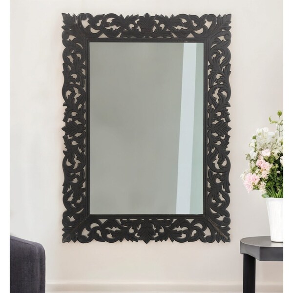 This 47-inch Black floral carved solid wood framed accent mirror is a decorative accent perfect for for most any room. This rectangle shaped mirror features beautiful carved floral cutwork that frames the glass in a charming and rustic style. Handcrafted from solid wood by true artisans, this piece is large in size to make a great focal point or centerpiece in your roo47-inch H x 35-inch W x 1-inch D