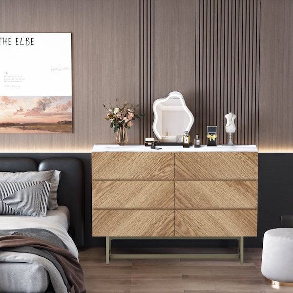 Make your room functional and visually enticing with this masterful 47-inch brown solid and manufactured wood six drawer dresser. This vertical standard dresser has a convenient and wide top area for your getting ready needs and supplies. Loaded with capacity, this piece is equipped with six easy open drawers for practical and good looking clothing storage. Its a high quality piece, made from high grade solid_and_manufactured_wood. 35-inch h x 47-inch w x 16-inch d.