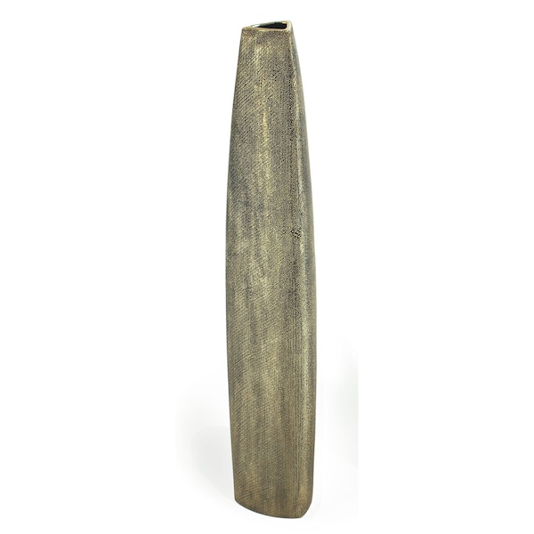 Enhance your living space with the 47-inch gold tapered ceramic floor vase. This stunning piece features a sleek tapered shape that adds elegance to any room. Crafted from high-quality ceramic, it boasts a luxurious gold finish that catches the eye and complements modern decor. The purposeful coat/paint distressing gives it a unique character, making it an exceptional focal point in your home. Perfect for showcasing your favorite floral arrangements or standing alone as a statement piece, this floor vase is versatile and stylish. Embrace contemporary design with this exquisite addition that elevates your interior while blending seamlessly with various styles. Transform your home decor with this charming and functional decor item. 47-inch h x 9-inch w x 9-inch d.