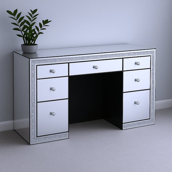 Say goodbye to cluttered counters and hello to a streamlined and luxurious beauty routine with our 47-inch silver mirrored glass and faux crystal seven drawer vanity table. Add a touch of modern glam style to your bedroom or dressing area with this fabulous sparkling mirrored vanity table. Complete with a total of sever drawers - three smaller, and four large drawers, this table has lots of storage space for your makeup and accessories so you that you can style and achieve your best look every day. 31.80-inch h x 47.20-inch w x 17.30-inch d.