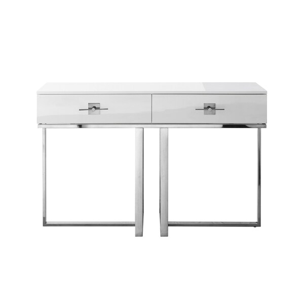 This good looking 47-inch white and silver metallic stainless steel coffee table with two drawers is not only practical, but good looking and built to last. The base of this table is made from stainless steel in a silver metallic color that creates a good looking visual contrast to the white manufactured wood tabletop. This classic rectangular table will be a great accent in any room it has a fresh design that will definitely breathe some fresh air into your interior. This coffee table is the sturdy, reliable and stylish answer to your living room needs. 29.7-inch H x 47.2-inch W x 15.4-inch D