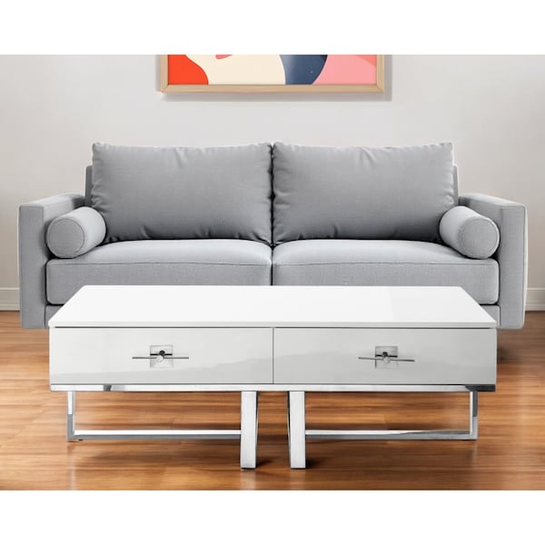 This good looking 47-inch white and silver metallic wood and stainless steel coffee table with two drawers is not only practical, but good looking and built to last. The silver metallic coloration of the uniquely shaped high quality stainless steel base marries nicely with the high shine, glossy white manufactured wood top surface. The two drawers feature modern horizontal drawer pulls and give you concealed storage that is great for the remote, magazines, mail and other accessories. 15.5-inch H x 47.2-inch W x 23.5-inch D