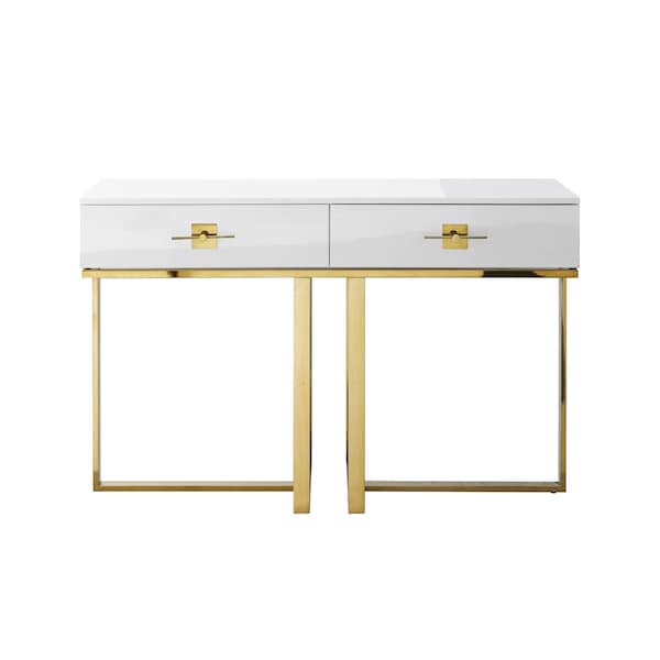 Make a statement in your entryway with our stunning 47-inch white and gold wood and stainless steel sled console table with two drawers. This rectangular table has clean lines and plenty of surface area. This table has a top made with white manufactured wood with a high gloss shiny finish that is known for durability and easy maintenance. In addition to a great top, our console table has a stainless steel sled base, meaning that it is well-built and secure. Versatile in use, console tables can be used for a variety of purposes in a variety of rooms and settings. 29.7-inch h x 47.2-inch w x 15.4-inch d.