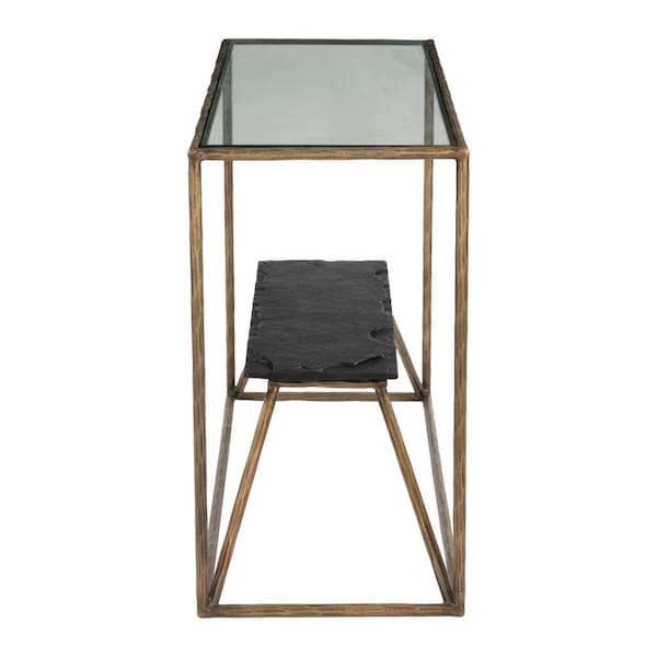 48" Clear and Brass Glass Iron and Stone Frame Console Table With Shelf